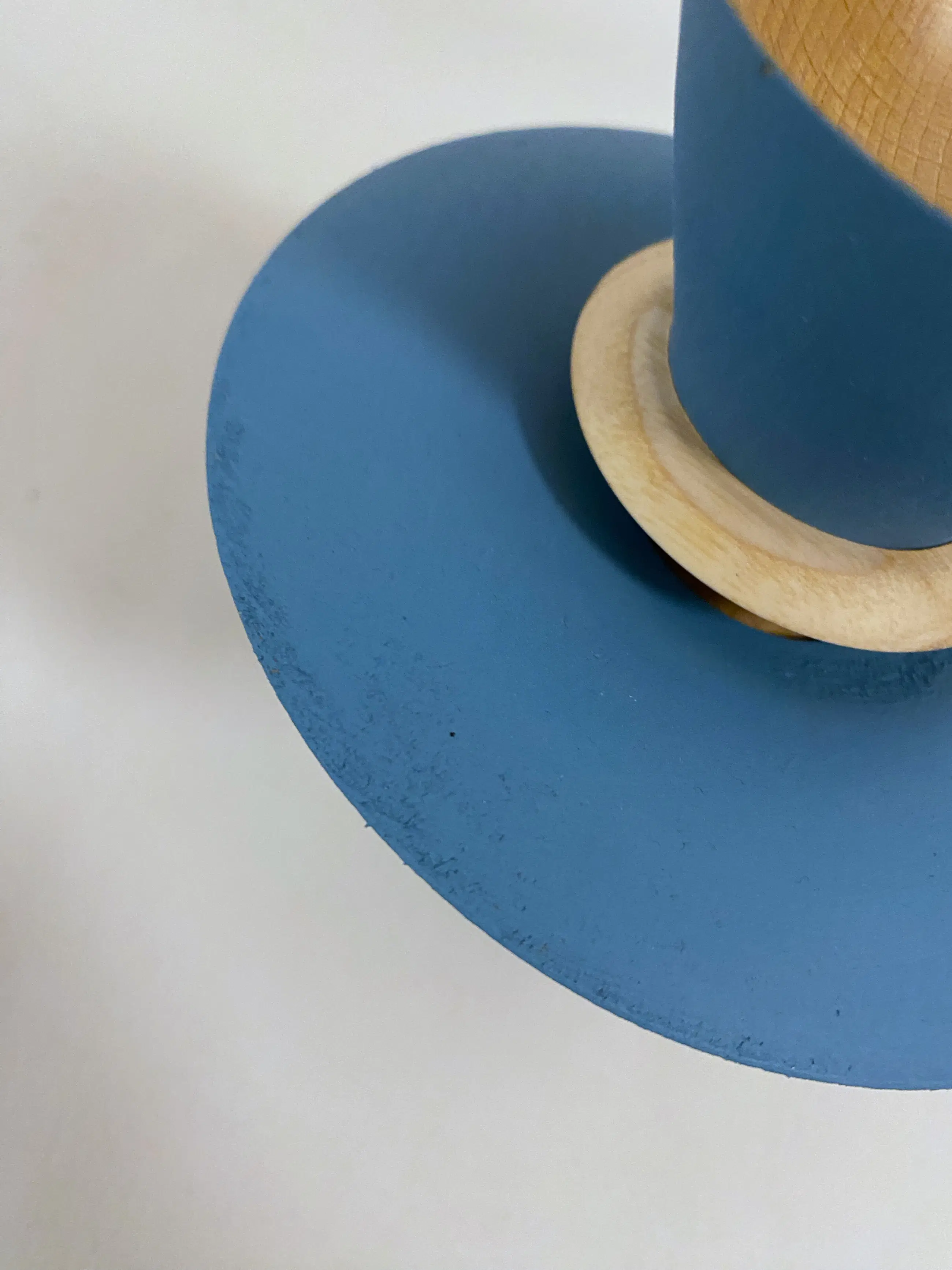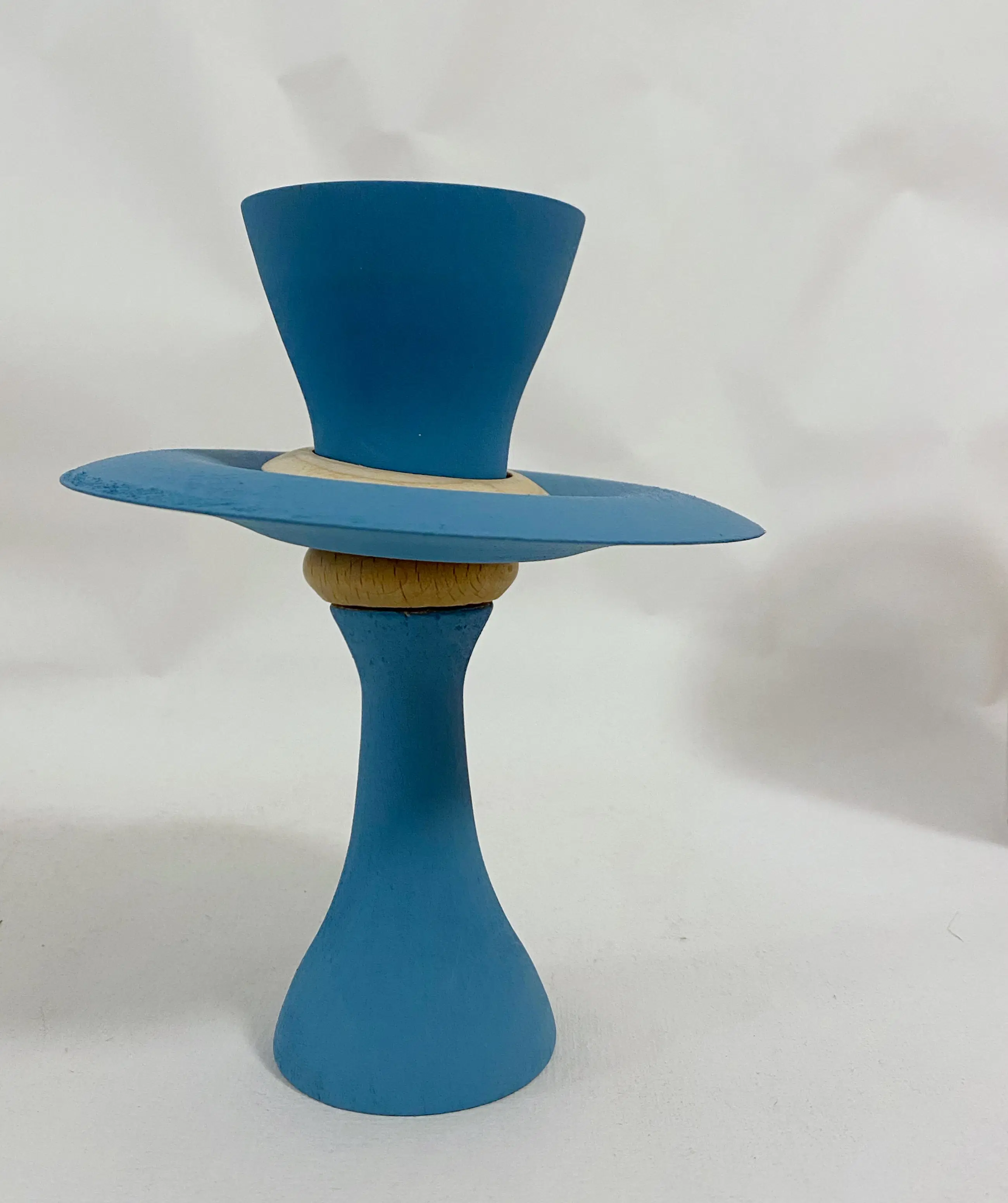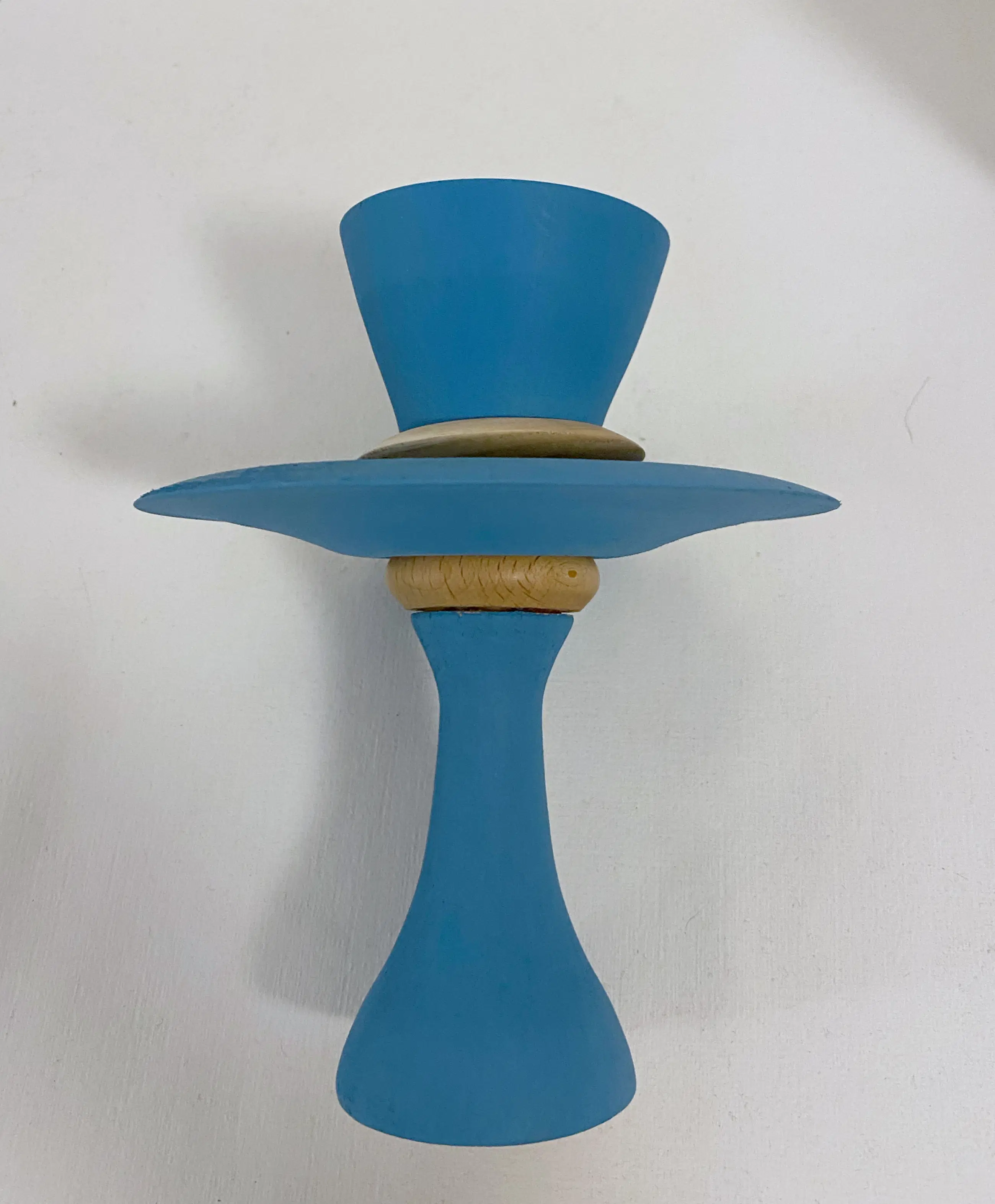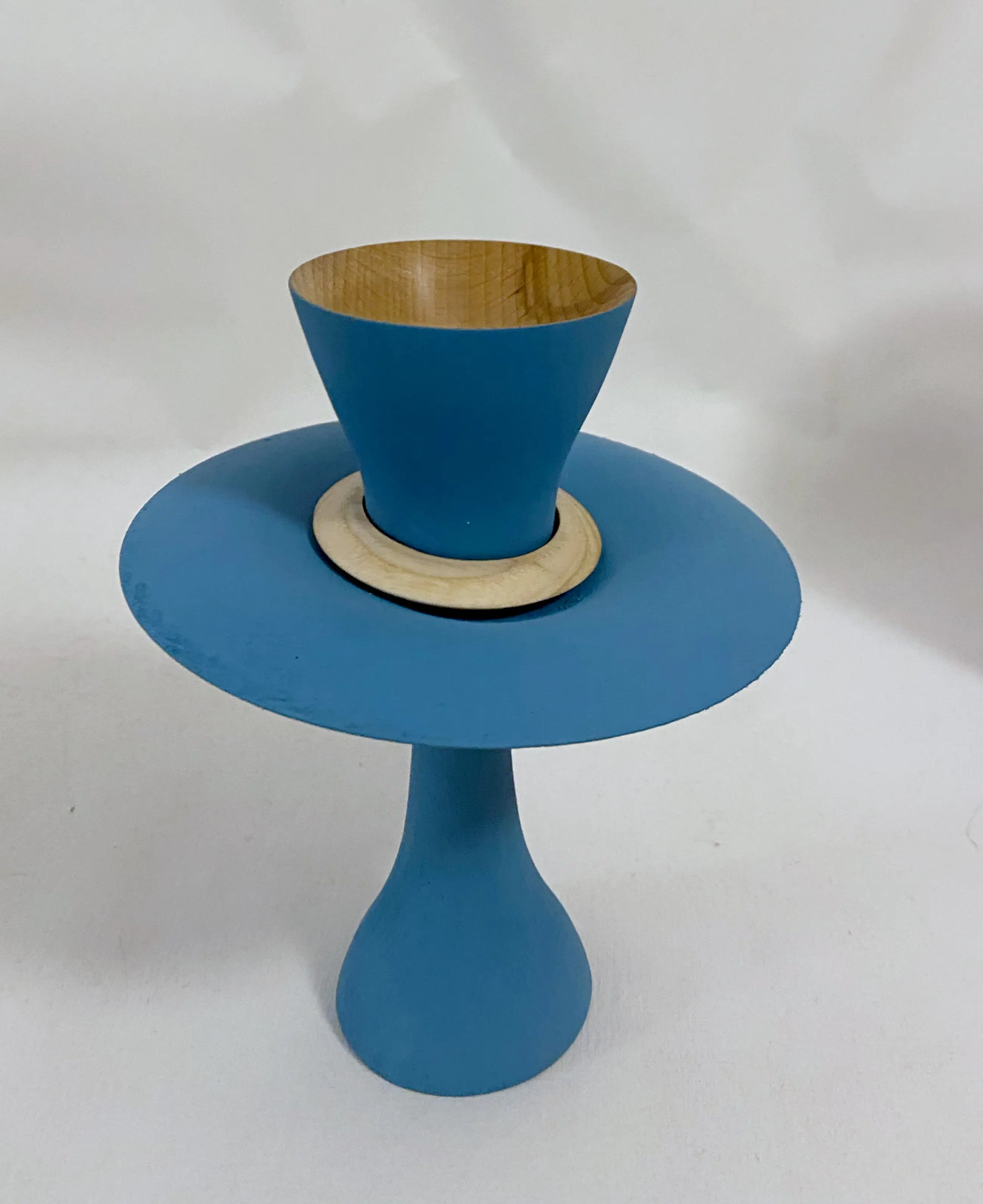 Handgedraaid object Meerdere houtsoorten en acrylverf mat. Blauw grijs met twee losse ringen En mooi gepolijst ‘gouden’ kommetje