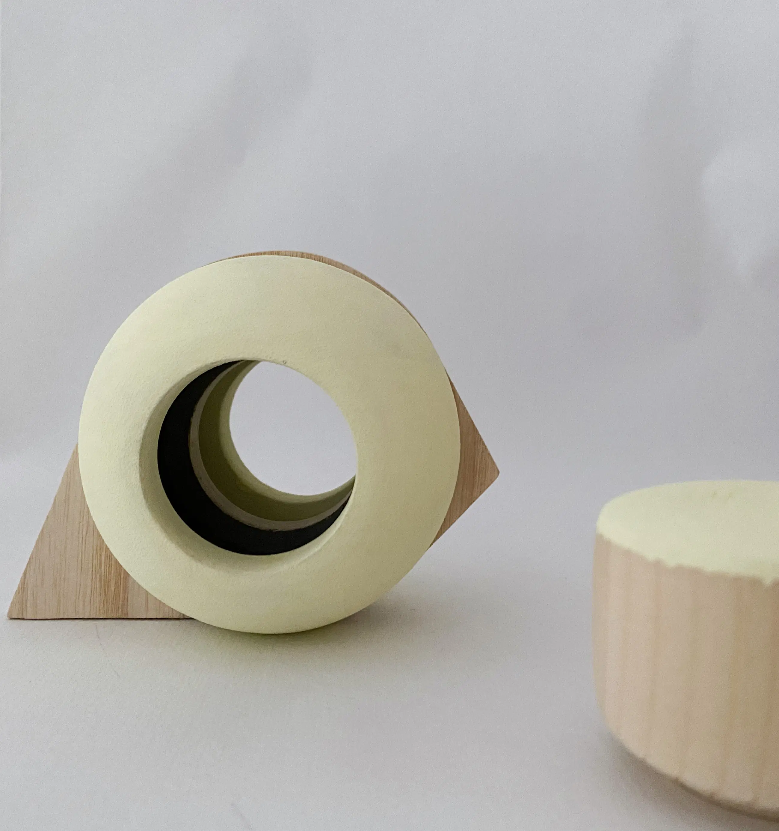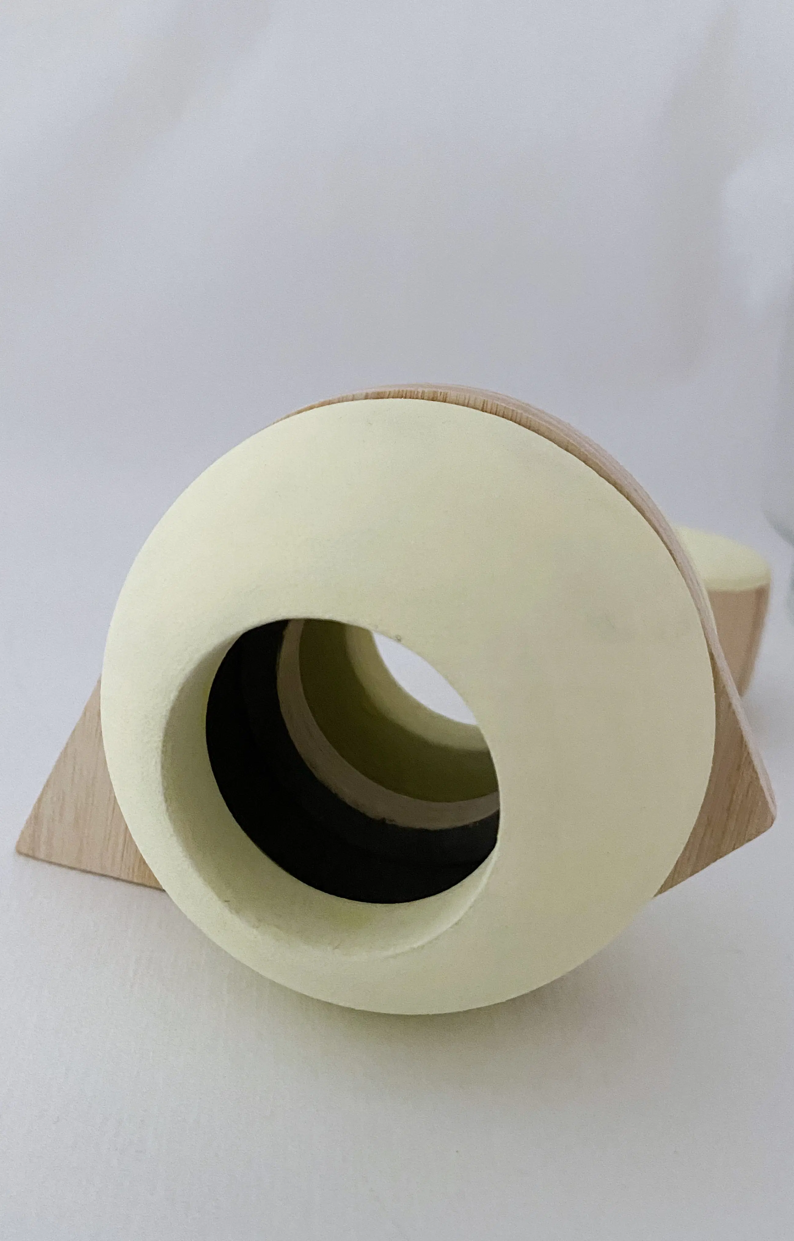 Handgedraaide houten object. Bestaande uit twee delen. De vogel is zacht geel met grijs en blank hout. Binnenkant van de vogel is open en kan dus gebruikt worden voor het plaatsen van kleine sieraden oid. Het struikje heeft een zacht gele bovenkant