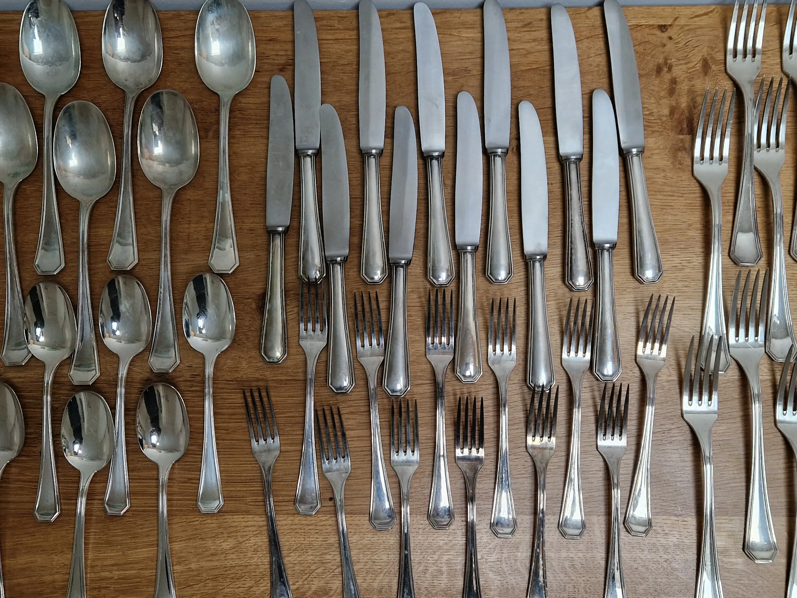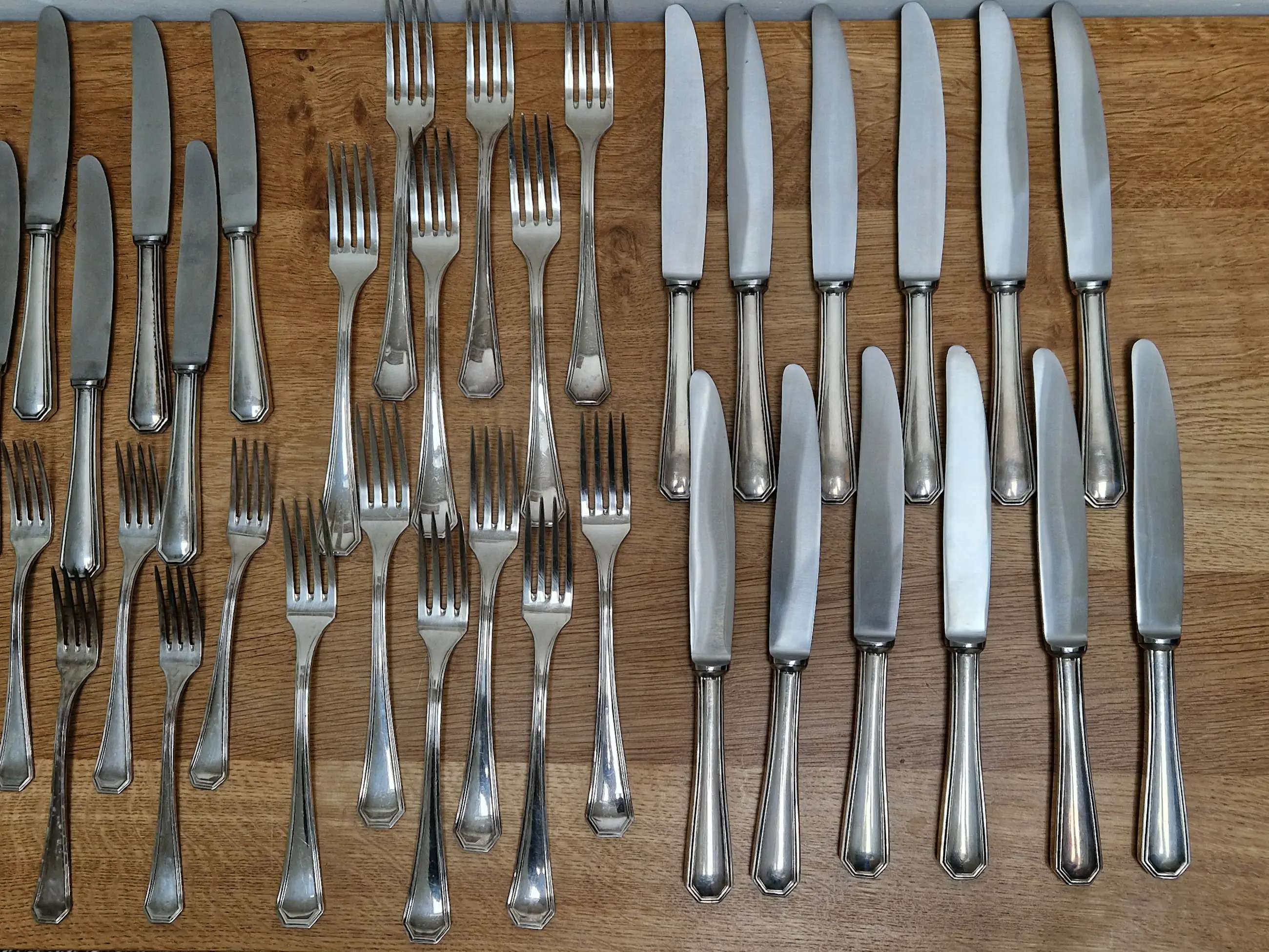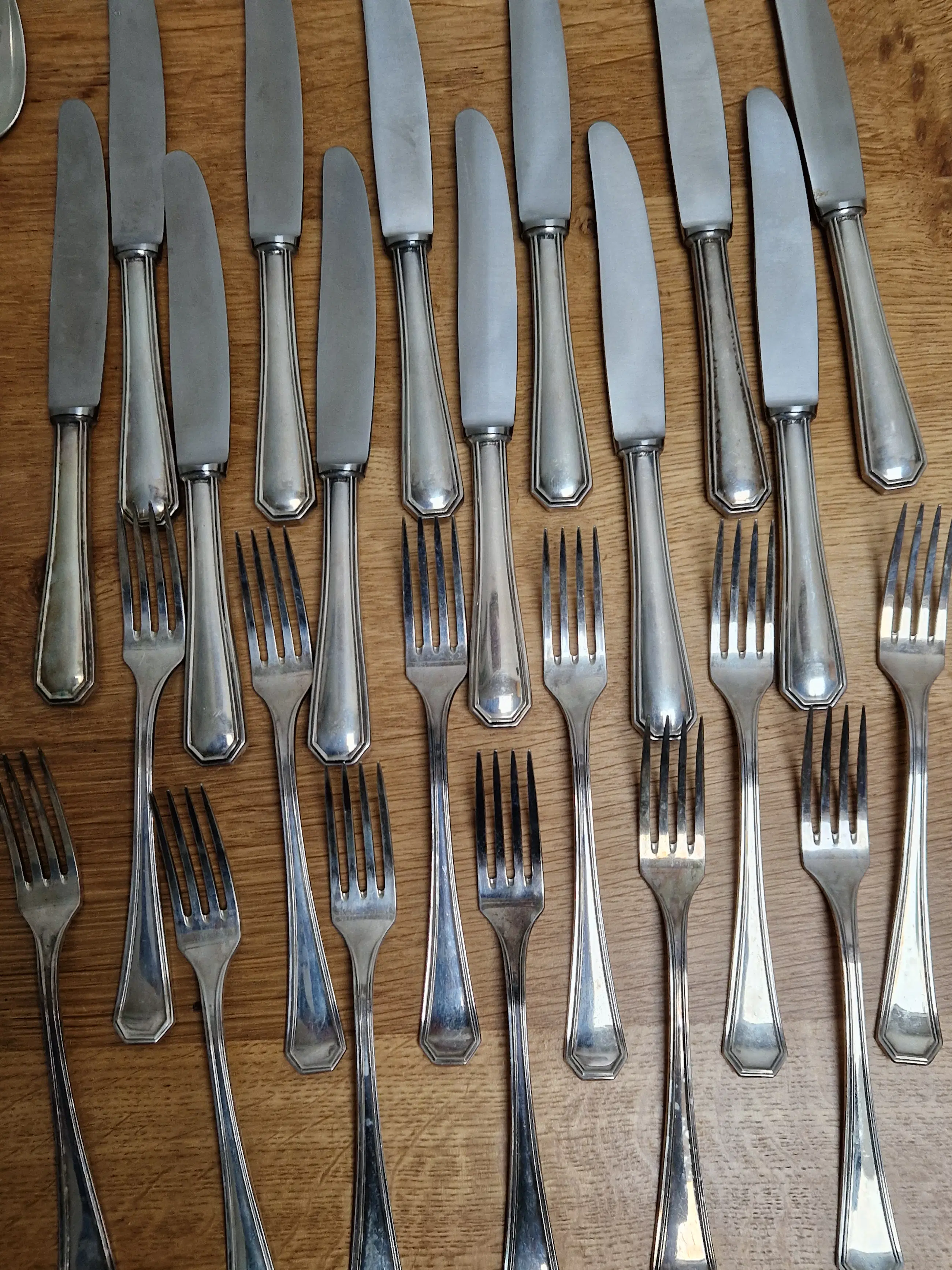 Zilveren bestek set van Zaramella Argenti uit Padua, Italië. Het betreft de 12 persoons set genaamd 'Ottagonale' uit 1976. Elk individueel item is gemerkt met het meesterteken 'Z' van Zaramella, het gehalte .800 en de plaatsaanduiding 30PD (werkplaatsnummer 30 in Padua).