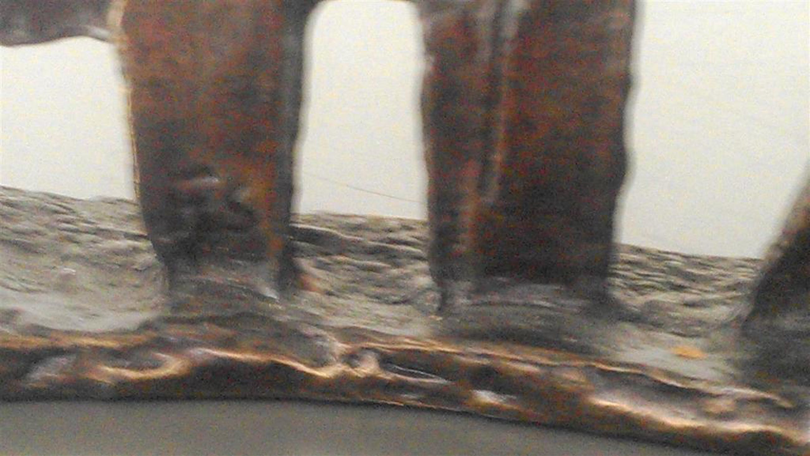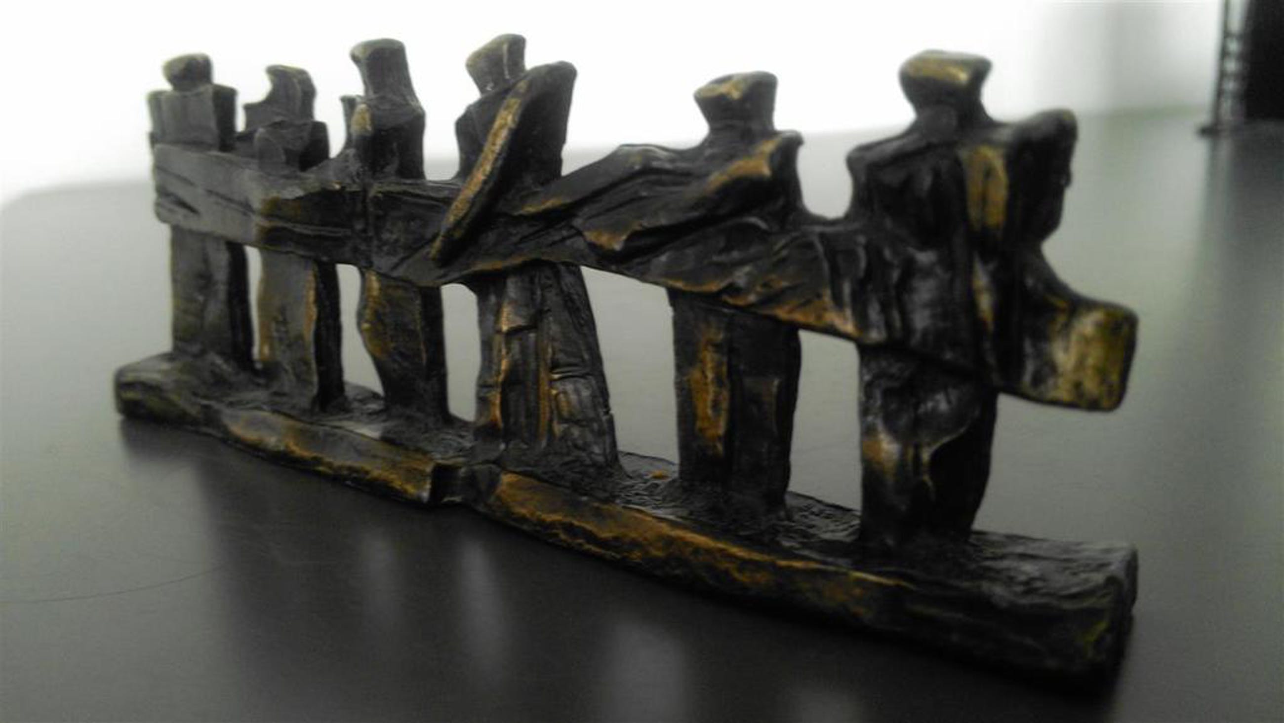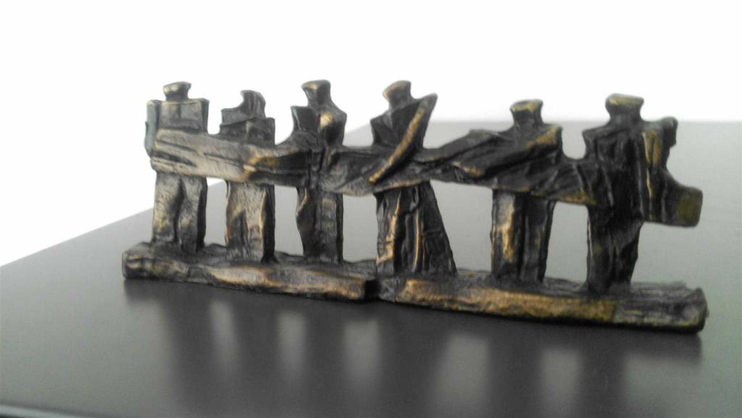 Gesigneerd F S ( zie foto) Klein maar fijn bronzen werkje van zes personen op een plateau die gezamelijk iets dragen