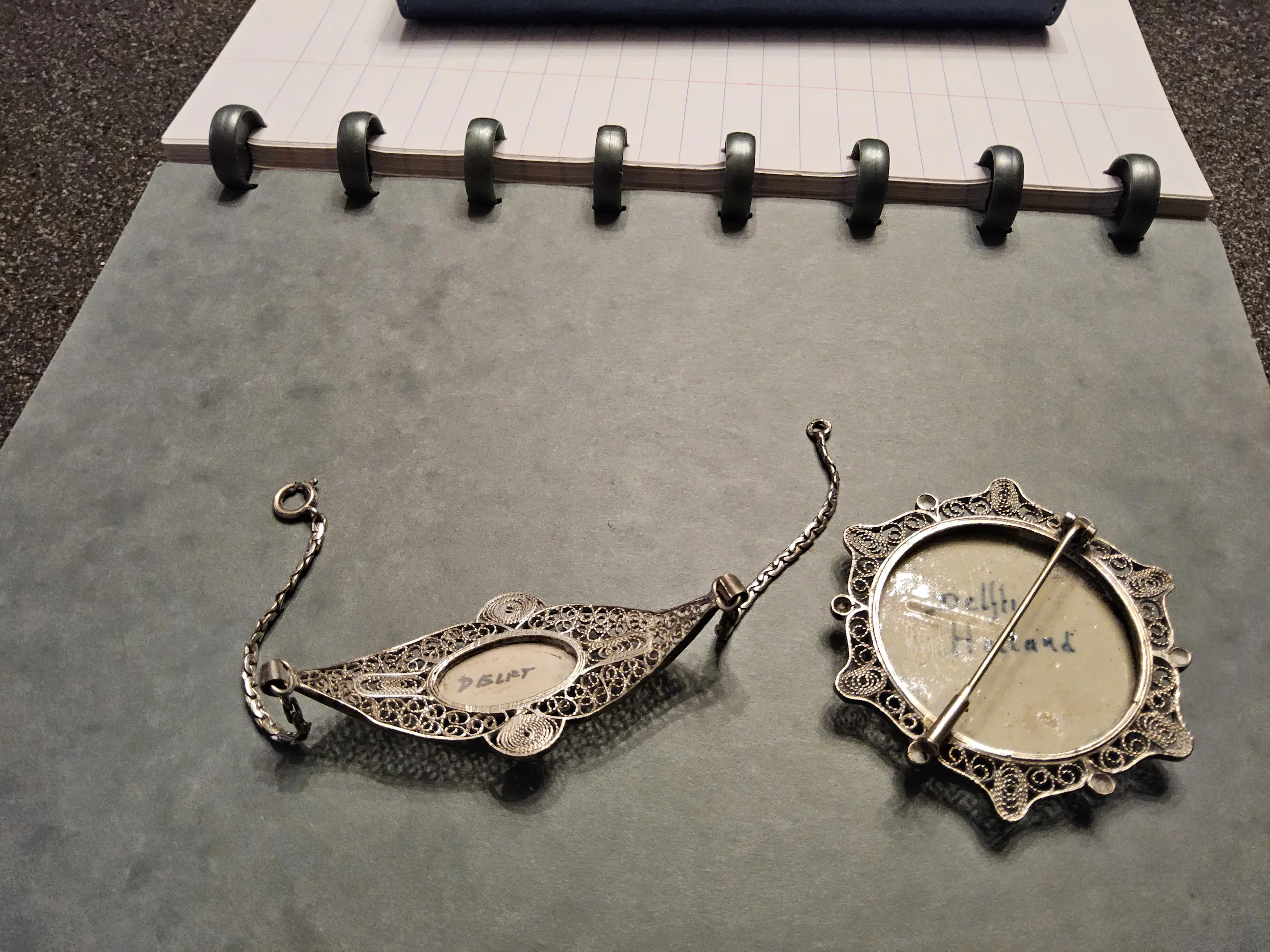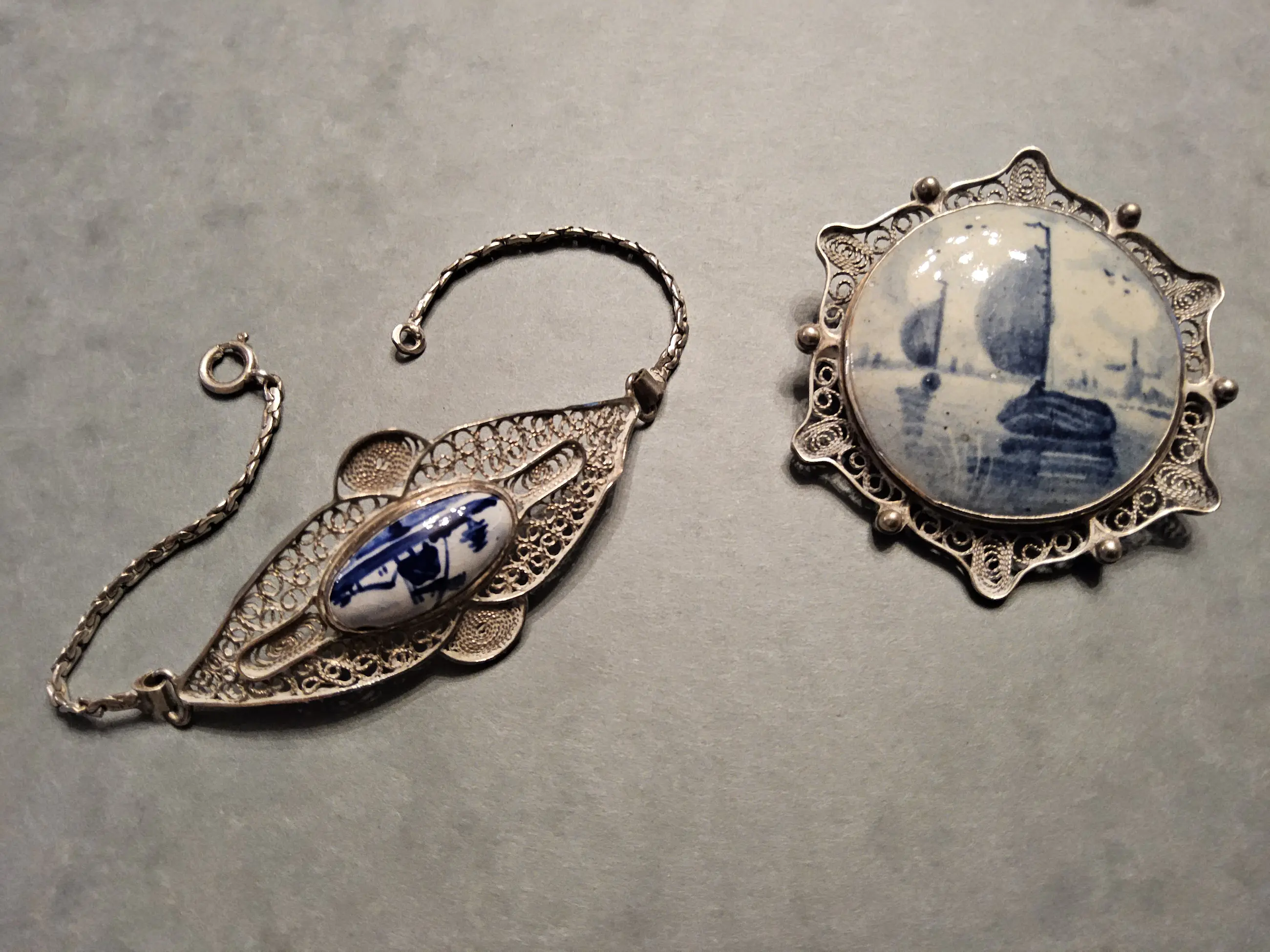 armband en broche in filigree zilver met ingewerkt delfts porselein. beide slotjes zijjn in perfecte staat en het porselein is intact.