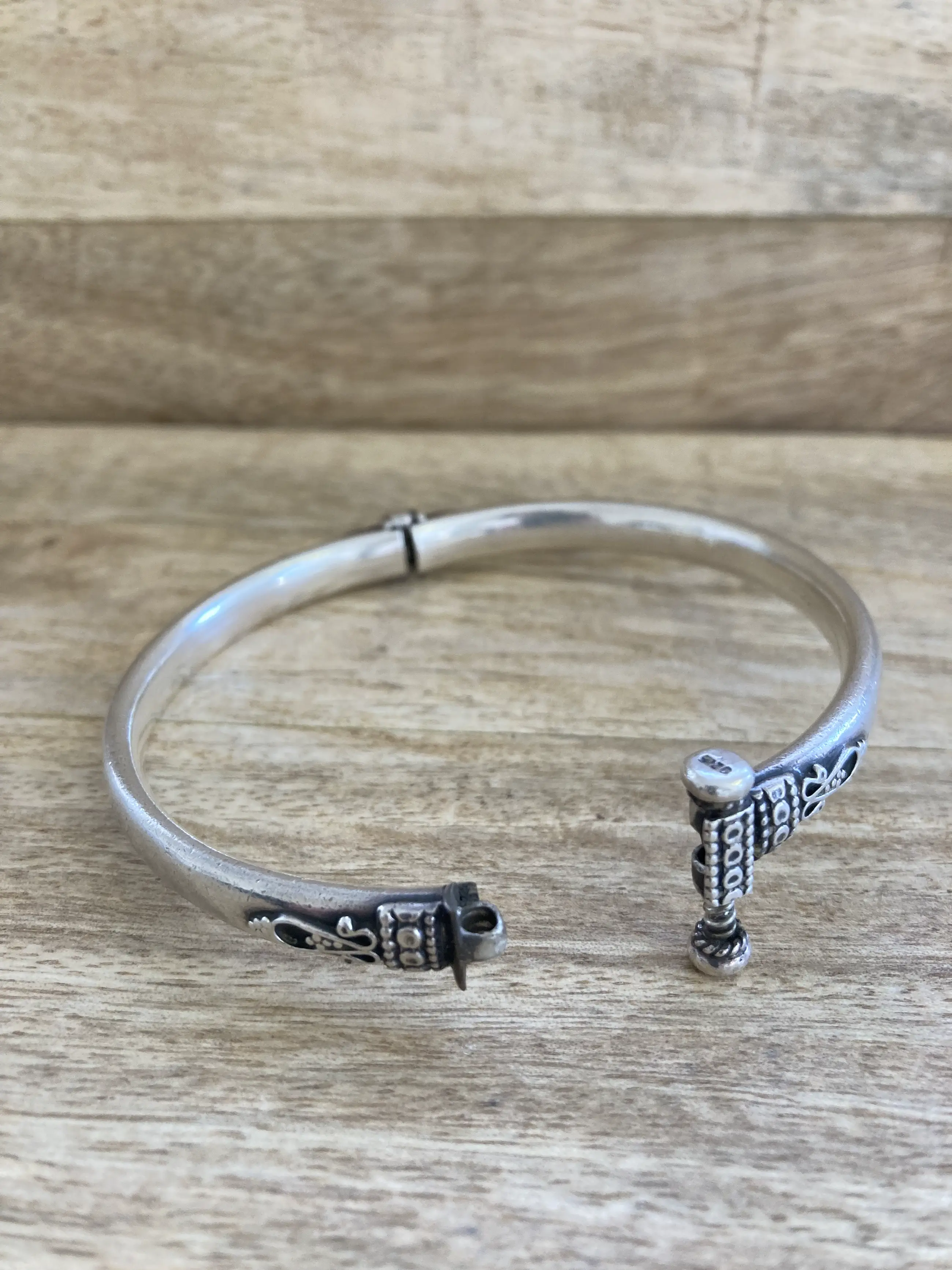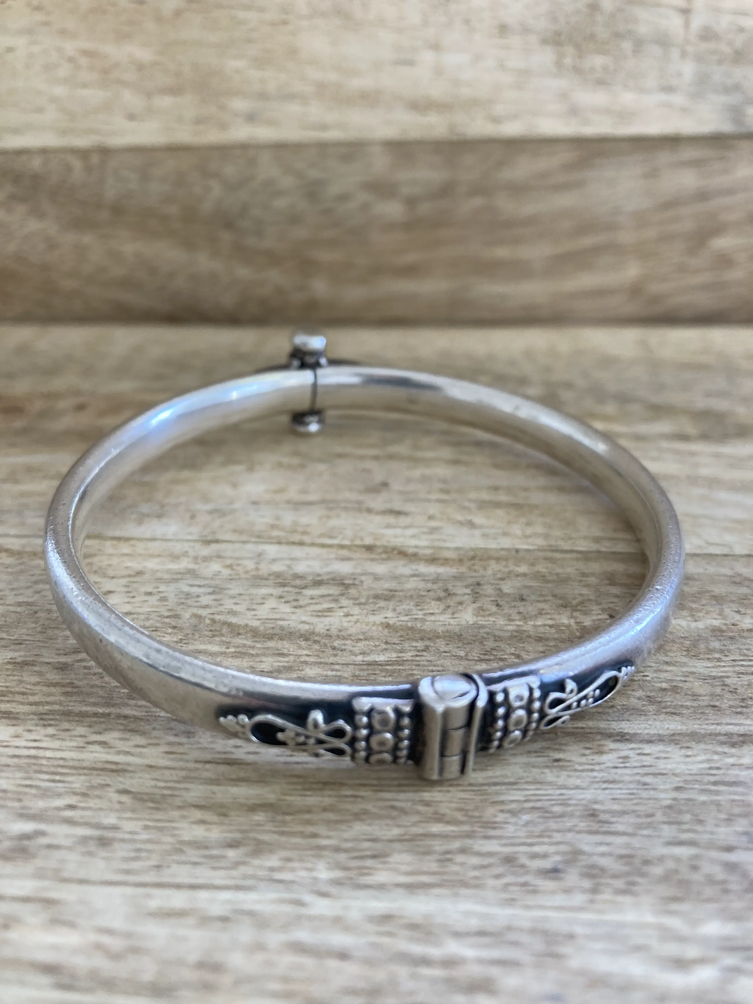 Zilveren armband met scharnier en schroef sluiting, geoxideerde bewerking.