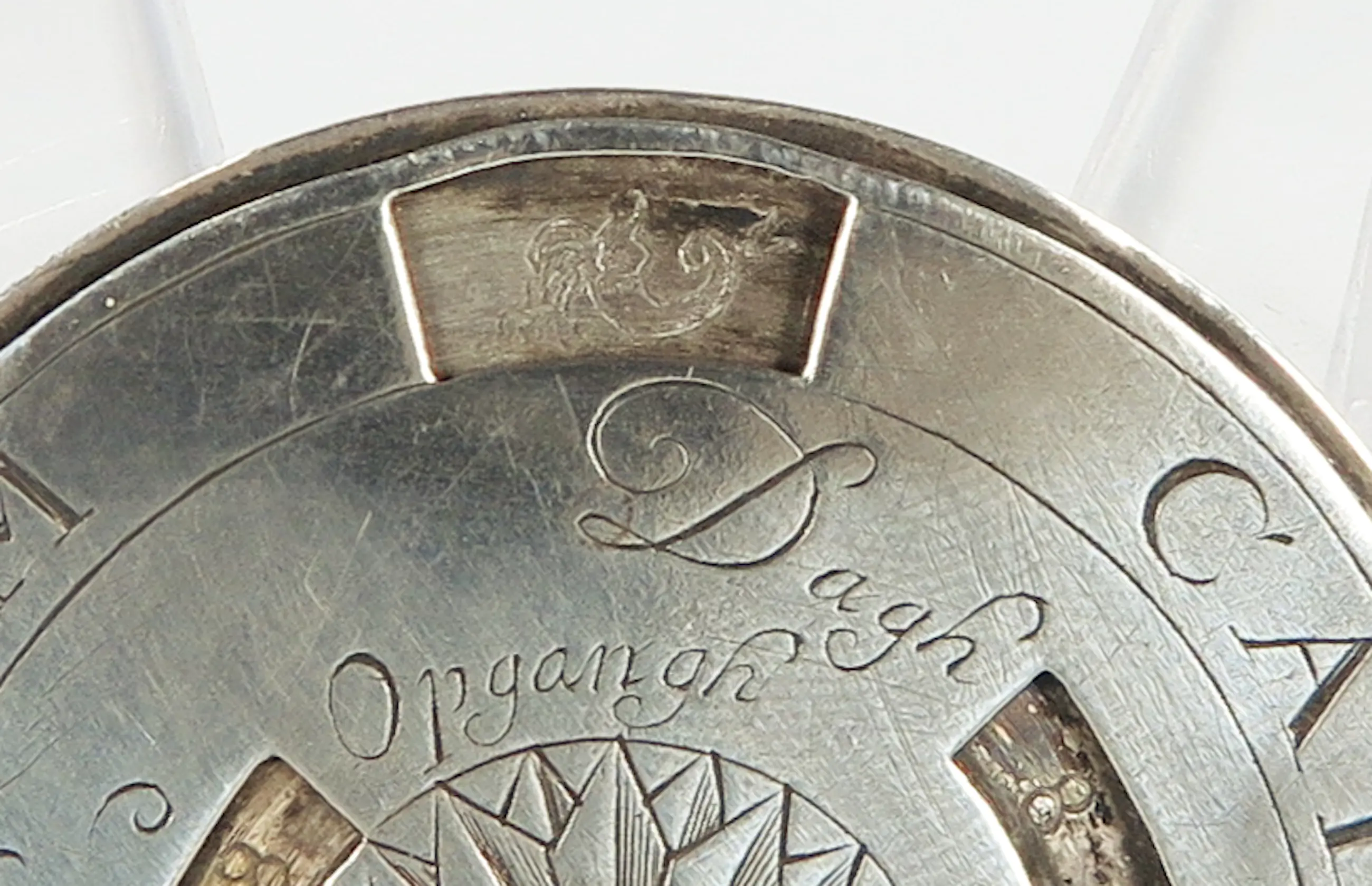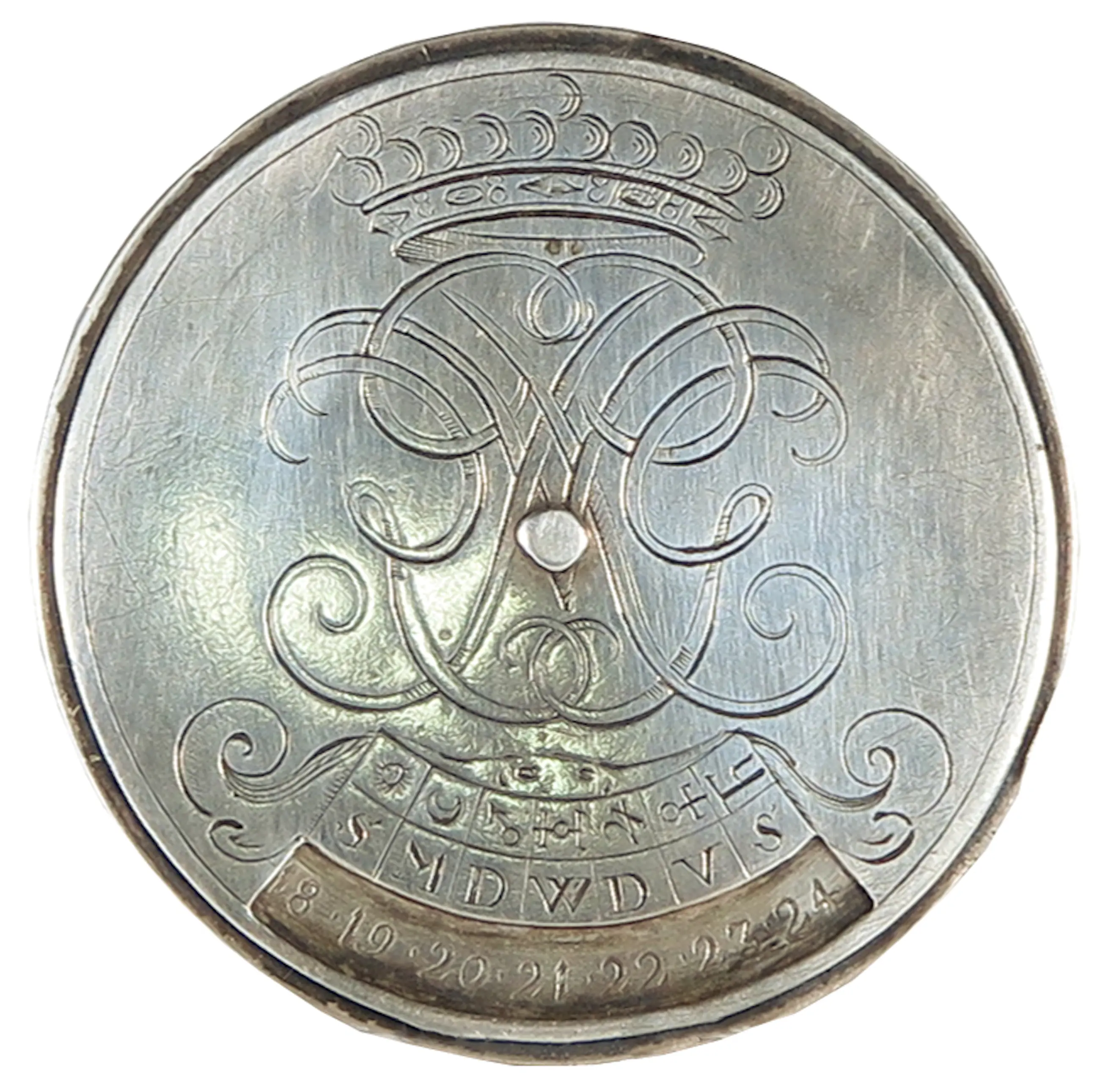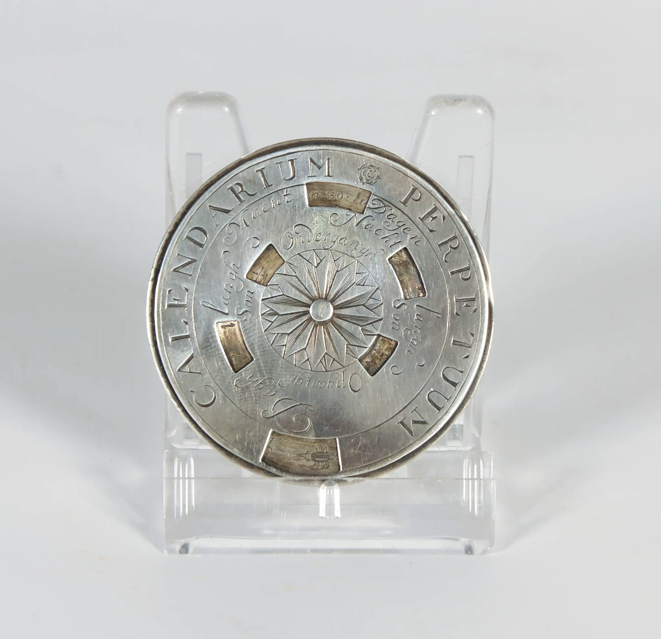 Een zilveren eeuwigdurende kalender ofwel Calendarium Pepetuum, opgebouwd uit twee ronddraaiende schijven. Deze werden omstreeks de 17e eeuw gebruikt om de datum en tijd te lezen. Er zijn aan de voorzijde verschillende uitsparingen gemaakt waar sterrenbeeld, daglengte, nachtlengte en dergelijke zijn weergegeven. Aan de achterzijde de dagen van de maand. Zeer bijzonder!