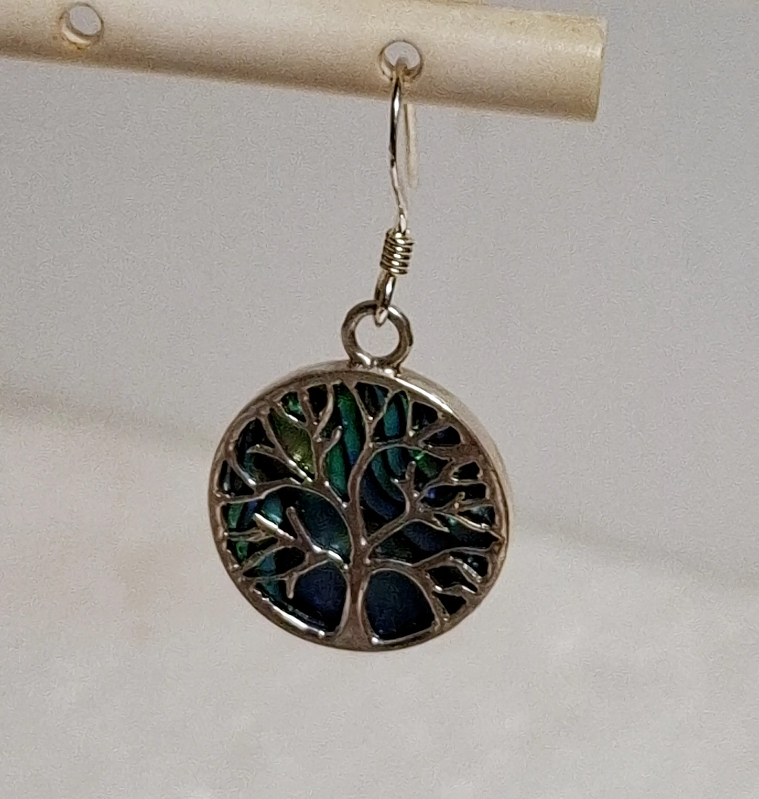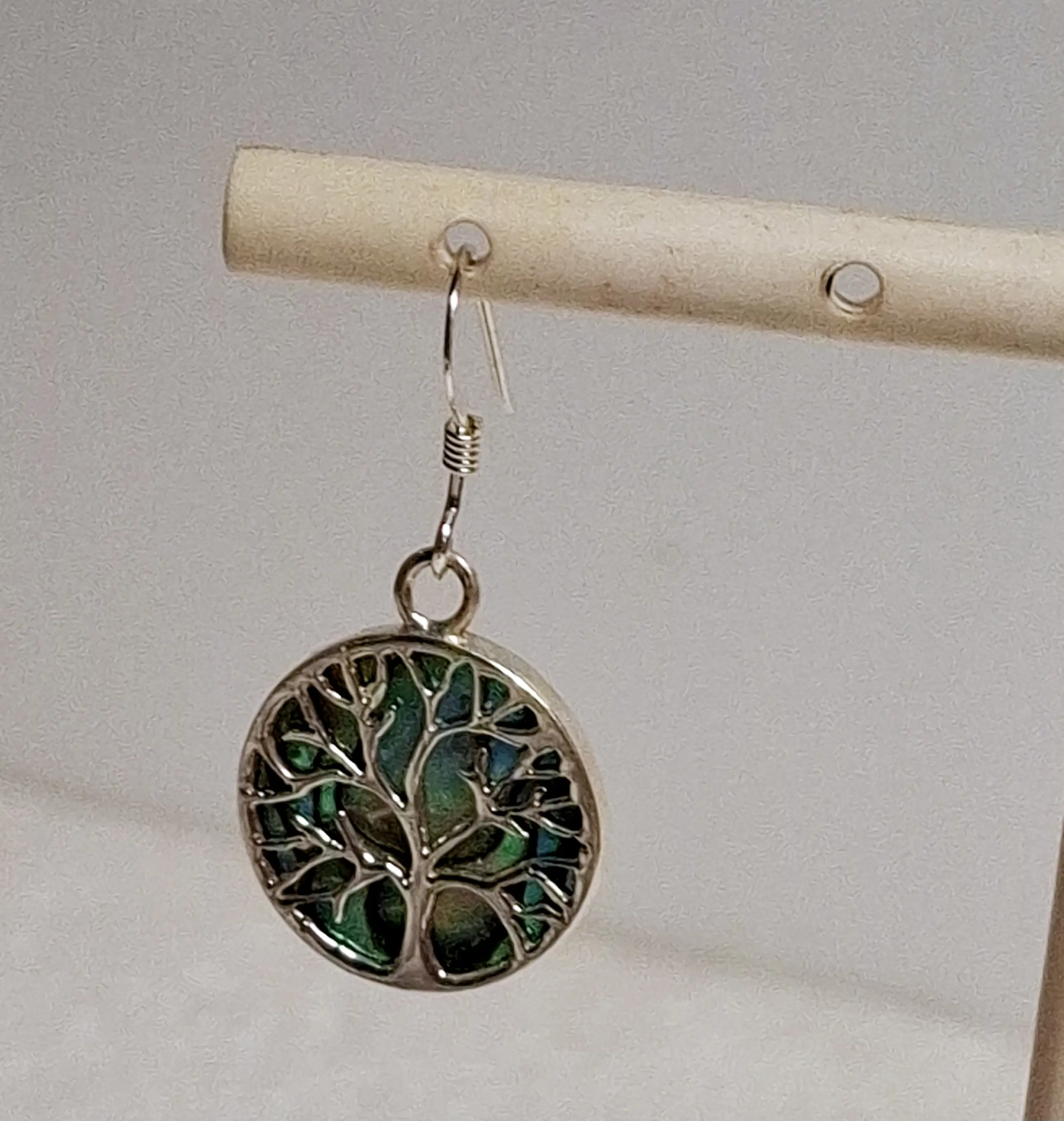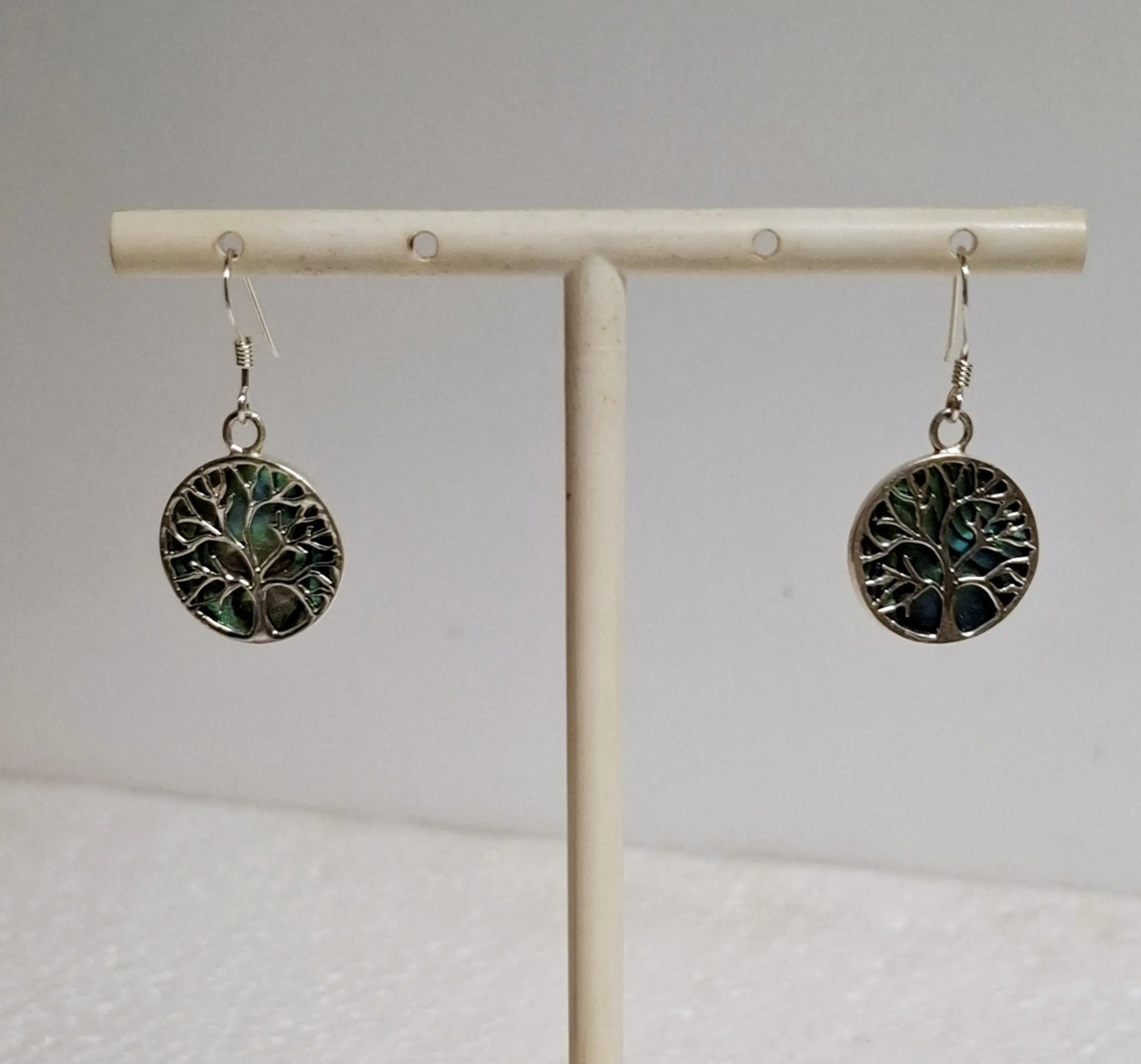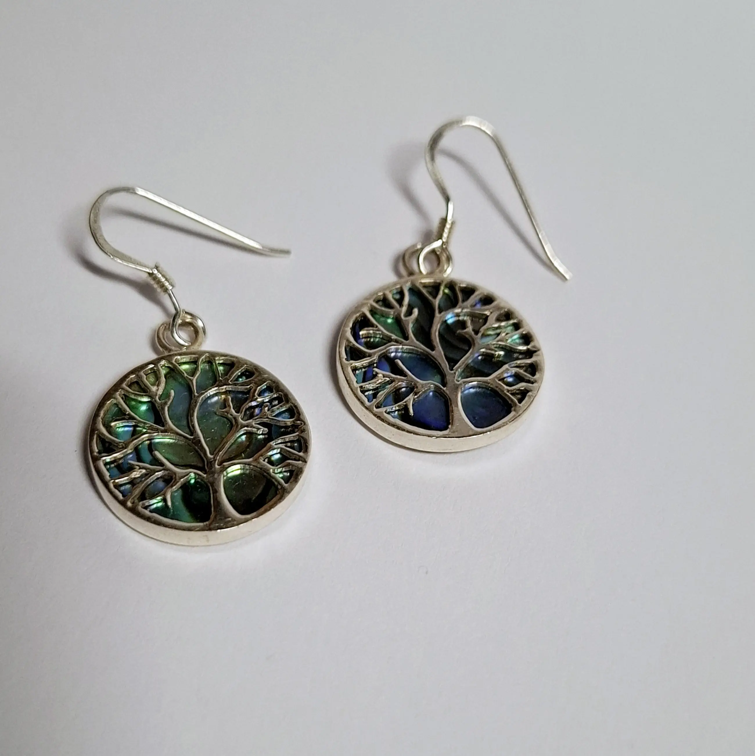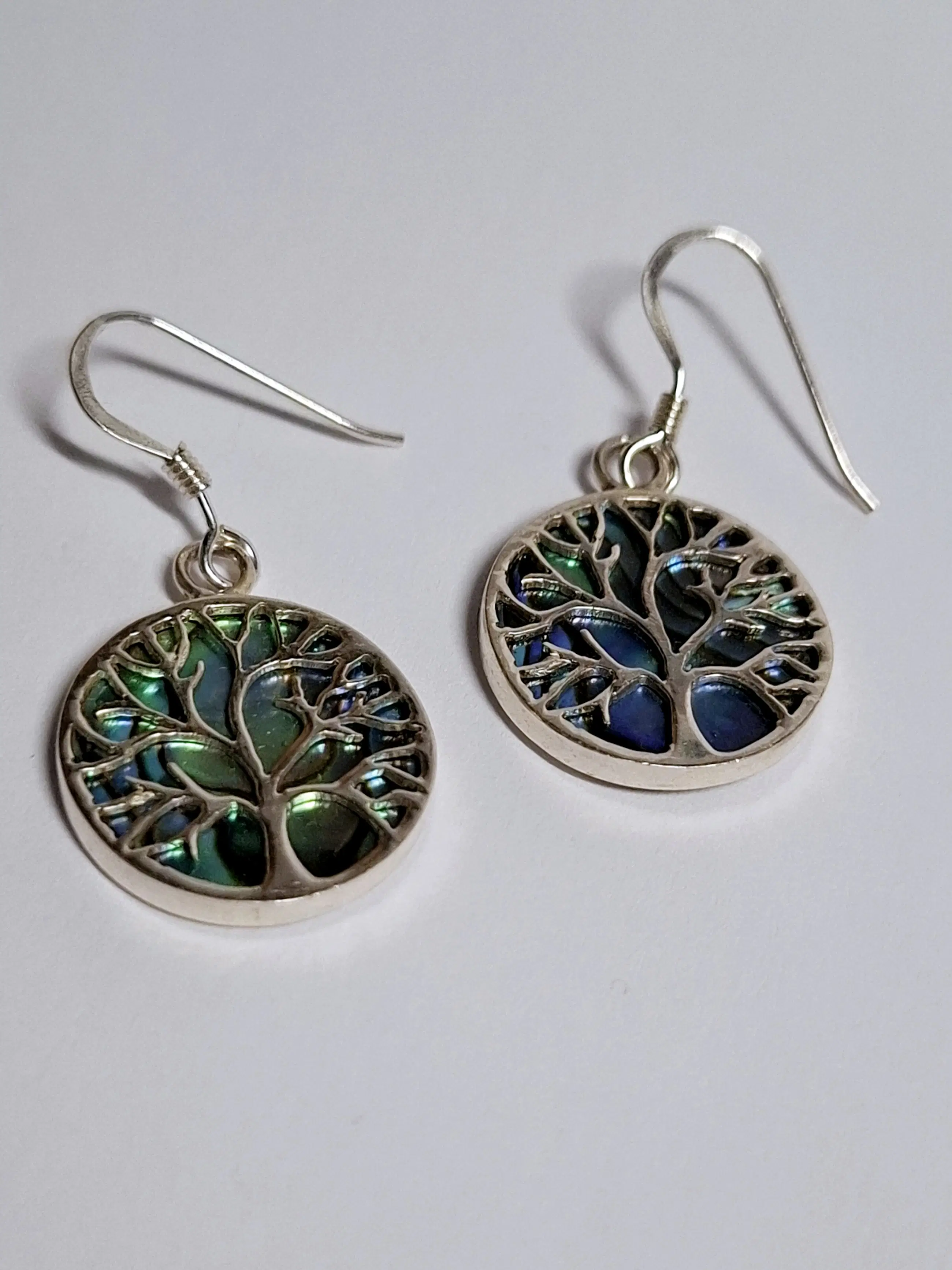 Nieuw Handgemaakte ronde hoogglans zilveren oorbellen met een mooie gedetailleerde levensboom, fraai opgelegd op kleurrijke abalone schelp. De levensboom is het symbool voor een lang leven. Het zilvergehalte is 925.. Totale lengte van deze oorbellen zijn 3,5 cm en wegen samen 3,48 gram.