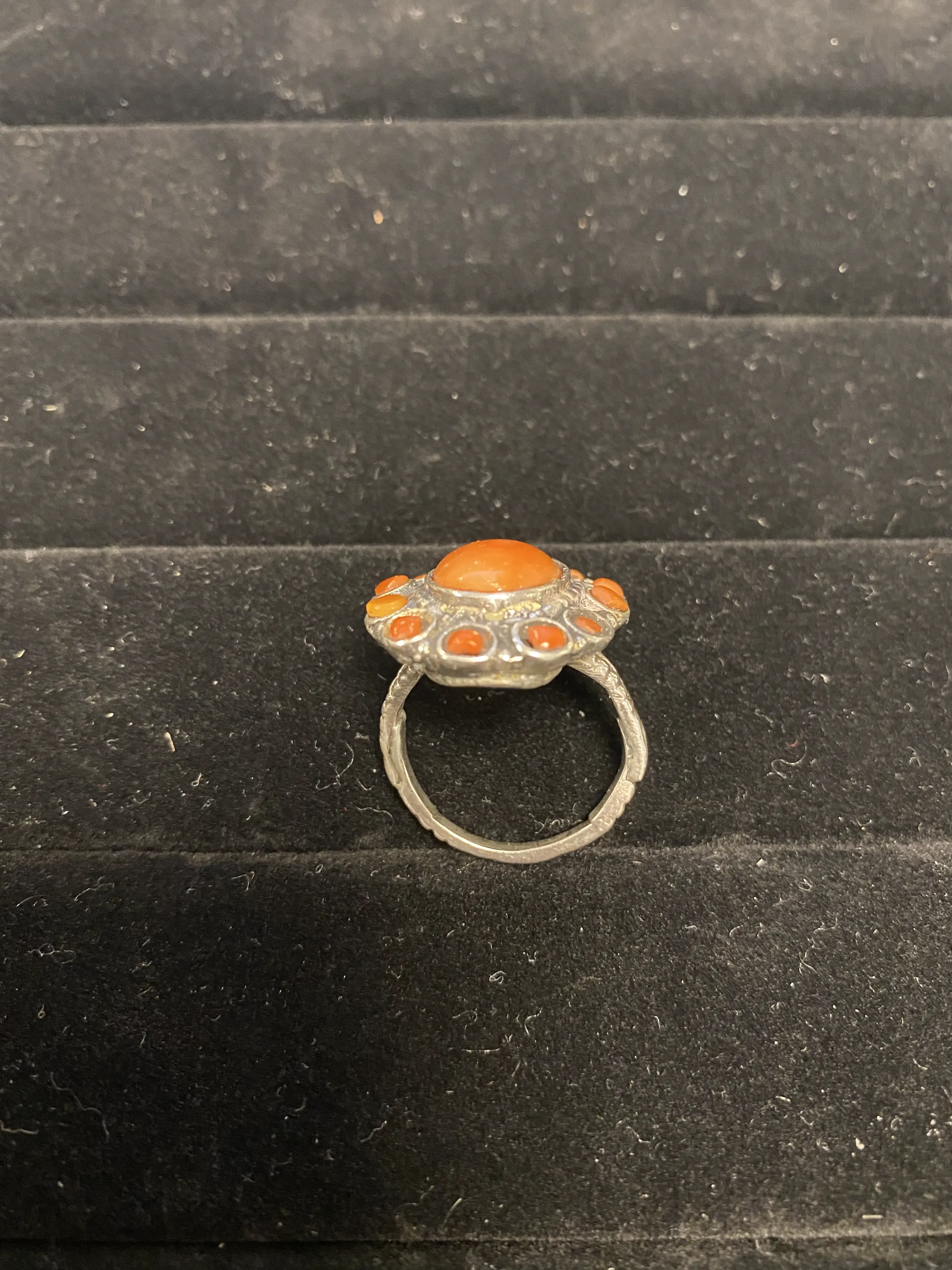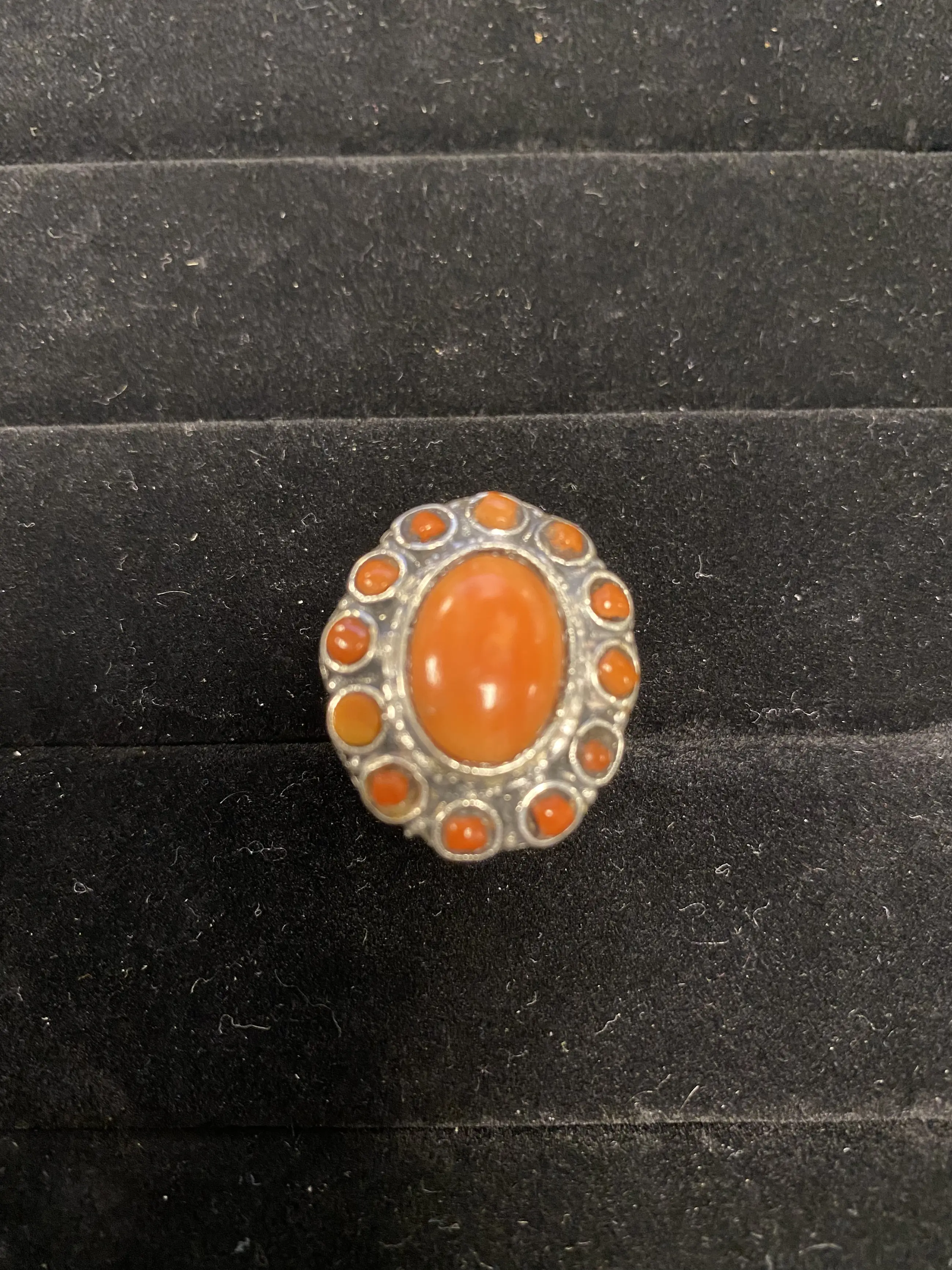 Zilveren Ring met bloedkoraal Bloedkoralen in verschillende maten Gewicht 8,7 gram Ringmaat 16.75 Gehalte 835/1000 zilver Lot 1-347