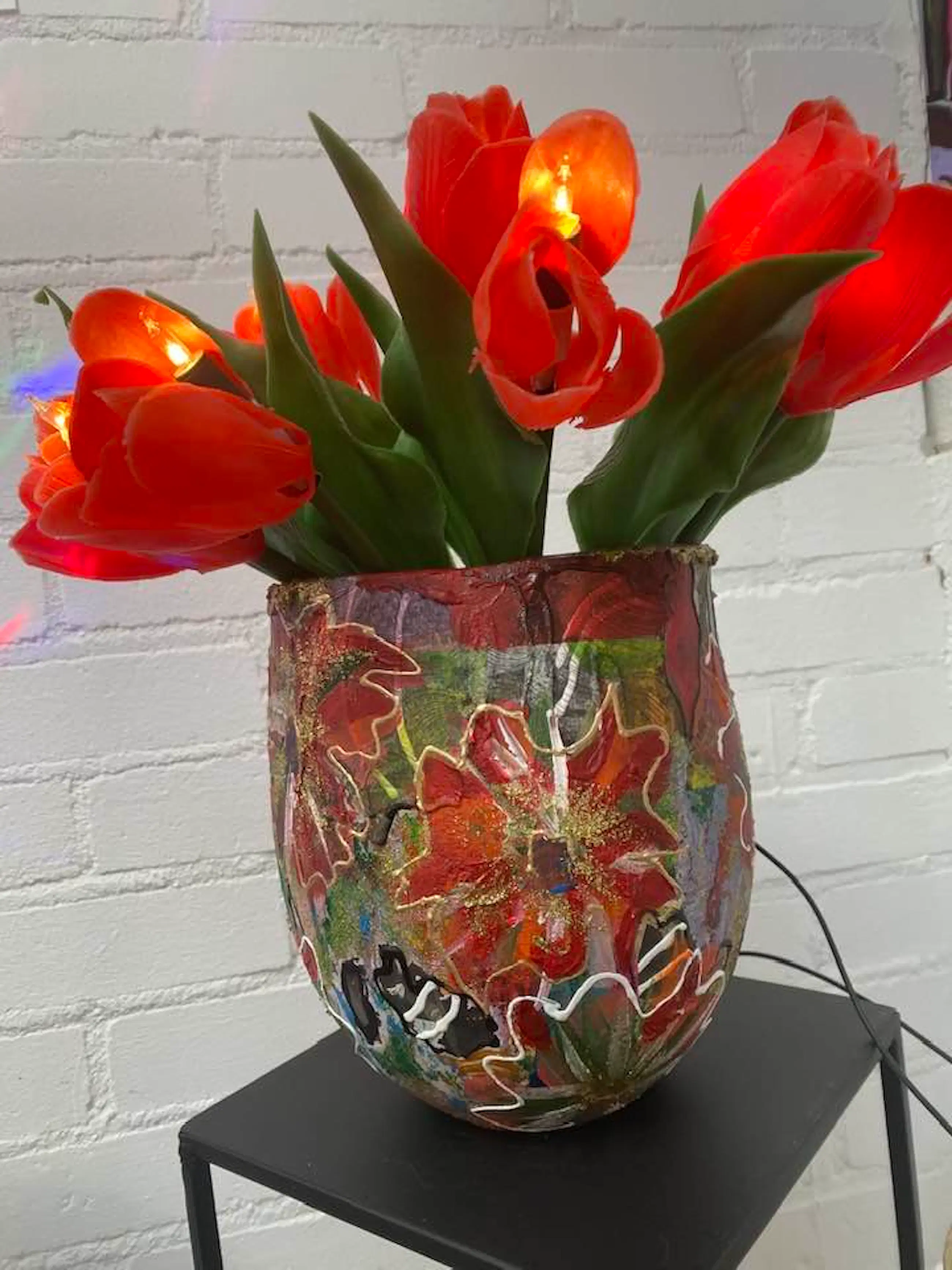 De Vaas is zonder de bloemen. Hoogte vaas : 20 cm Breedte vaas : 20 cm