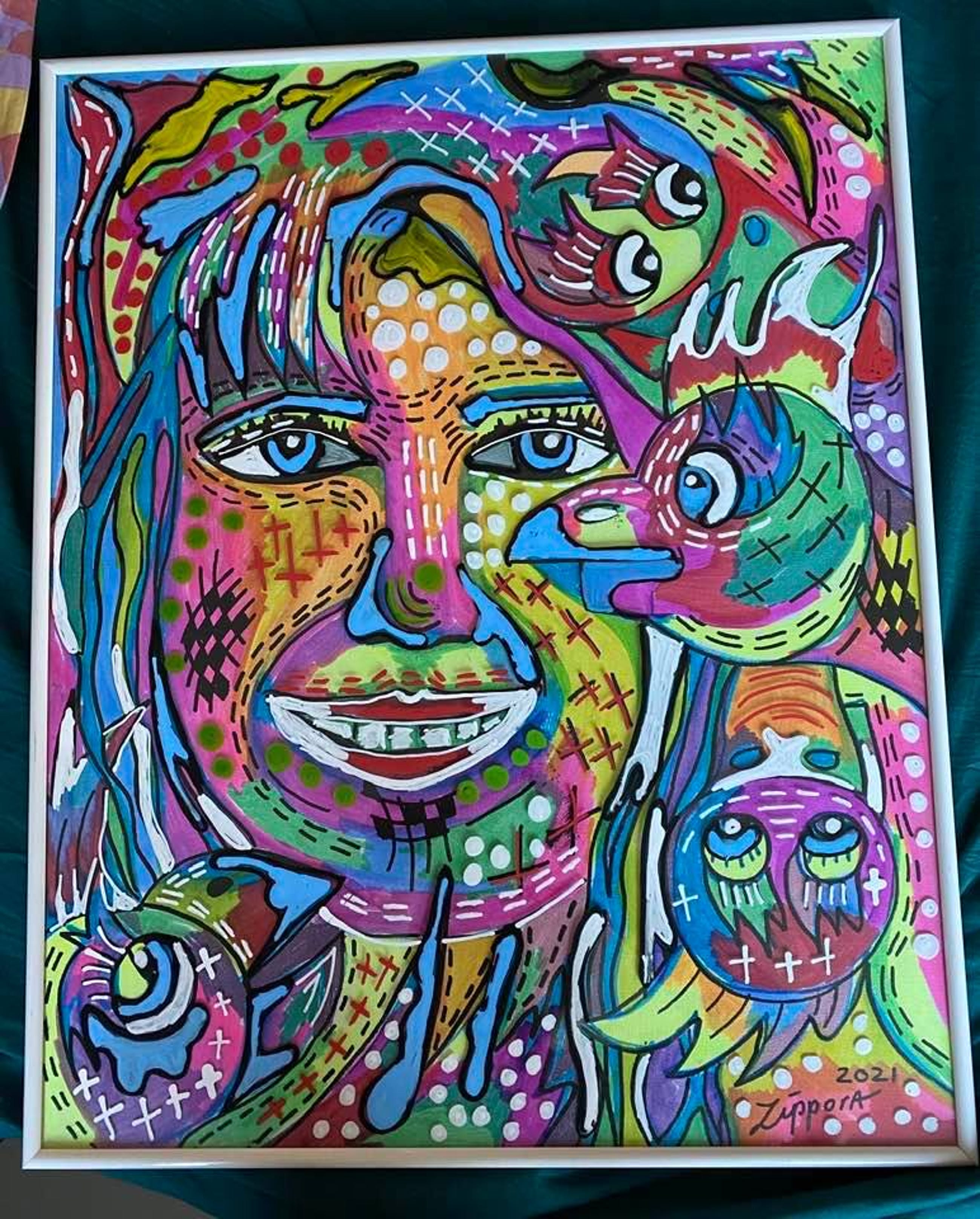 Het werk is op canvaspapier en glas geschilderd een uniek stuk Zippora Meijer exposeert nationaal en internationaal en staat geregistreerd bij het RKD
