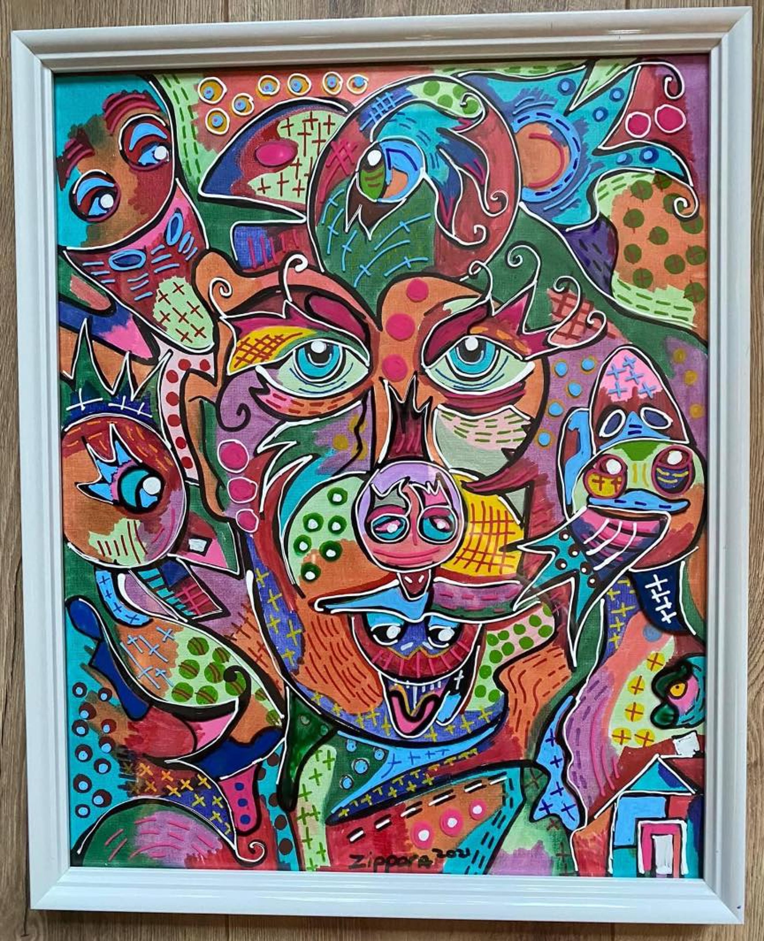 Het werk is op canvaspapier en glas geschilderd een uniek stuk Zippora Meijer exposeert nationaal en internationaal en staat geregistreerd bij het RKD