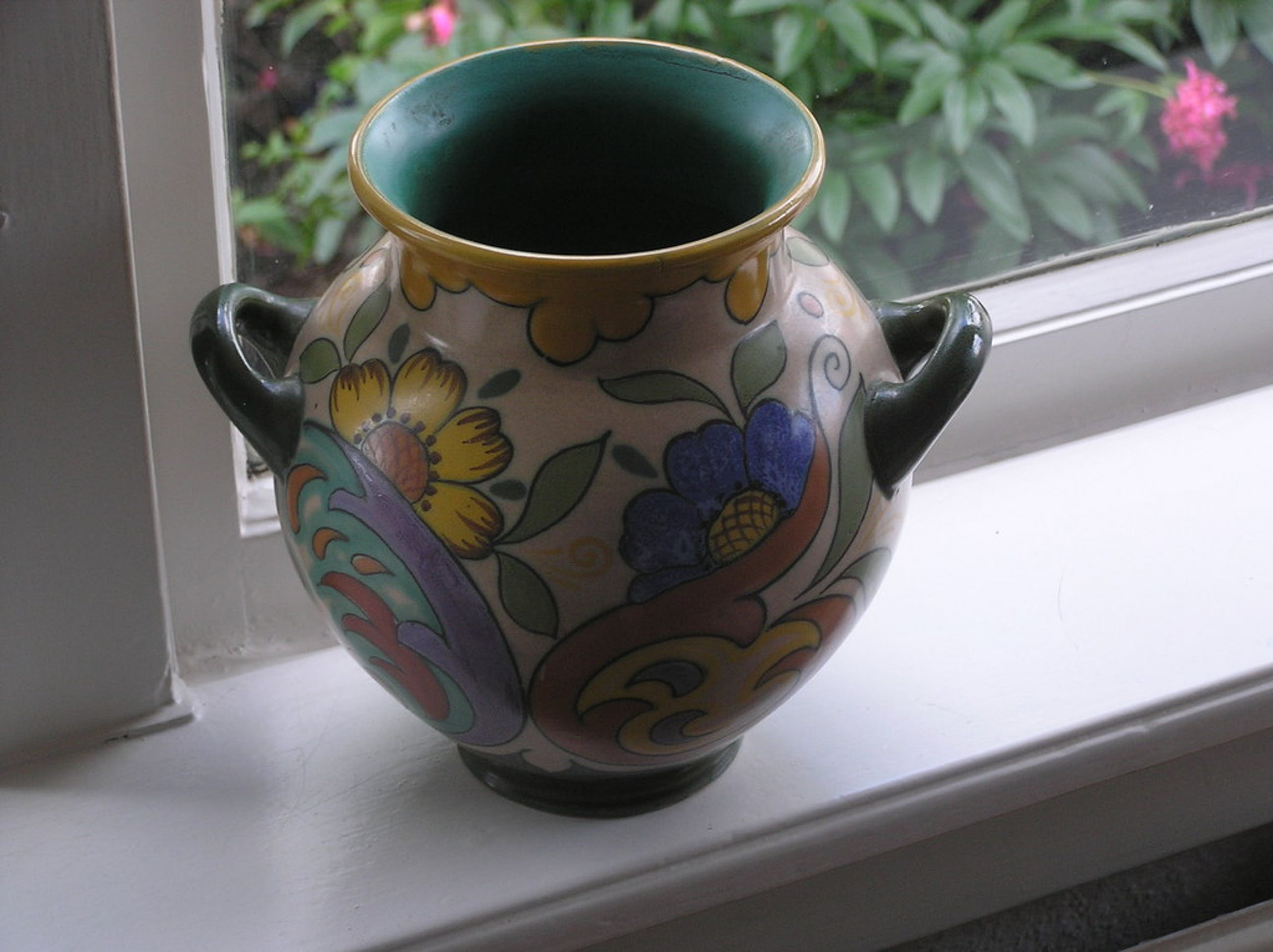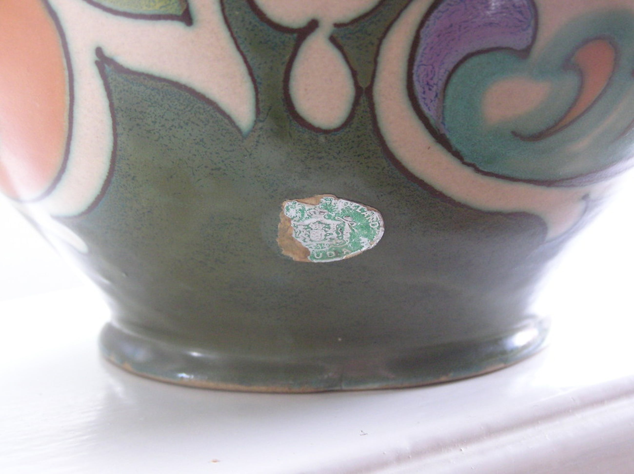 Grote platelen Oorvaas decor Corfoe. Helaas zit er op de voet een groete chip en de hals heeft ook een chip een reparatie. Onderzijde voorzien van geschilderd bilndmerk Zuid Holland, Gouda Holland, jaarmerk waarschijnlijk 1929, zou ook 1921 kunnen zijn en model en signatuur WK?? en decornummers; 2864 en 4029. Afmetingen; 22 cm hoog en 28 cm in diameter.