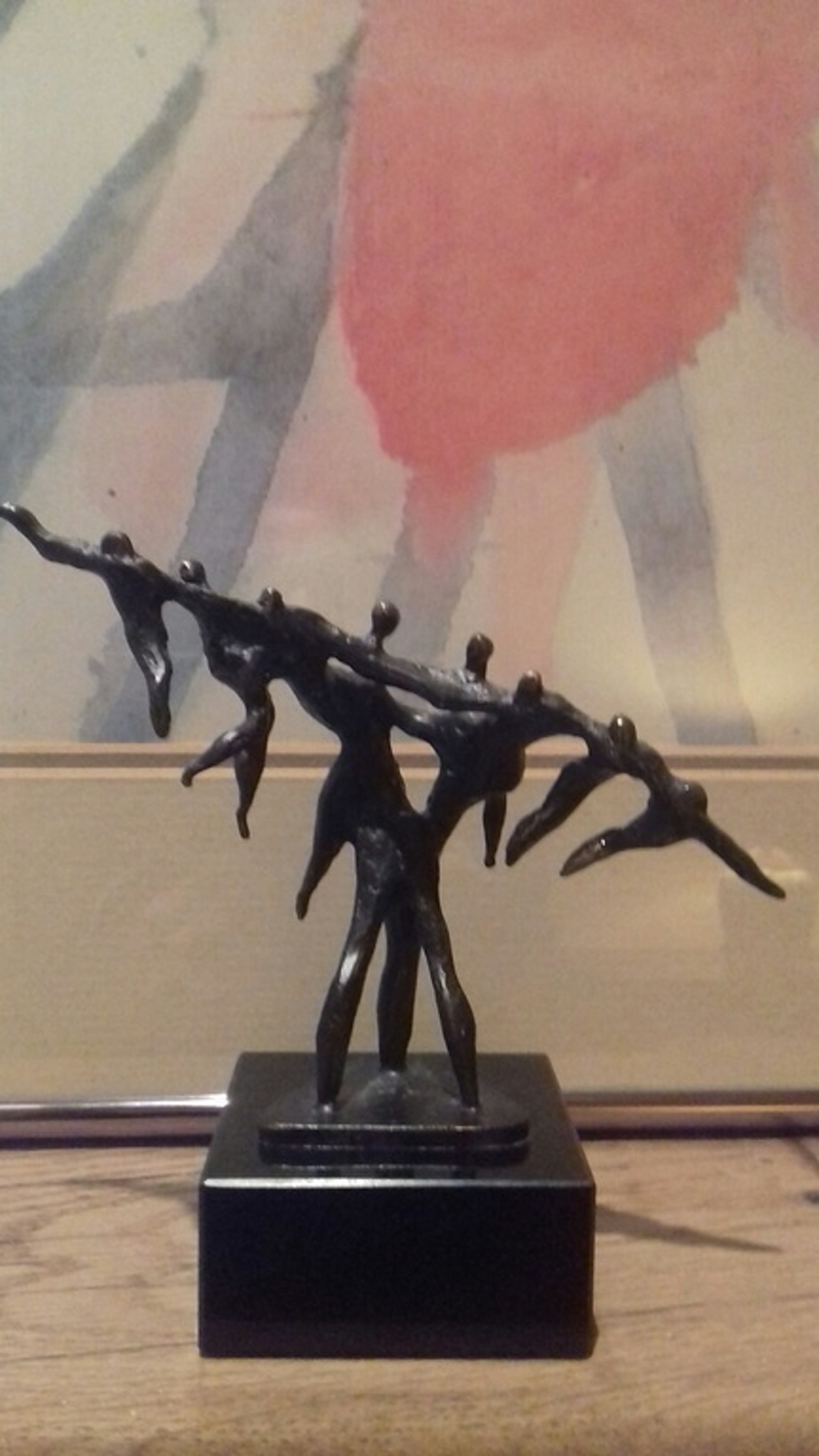Zwaar verbrondsde sculptuur op marmeren sokkel.