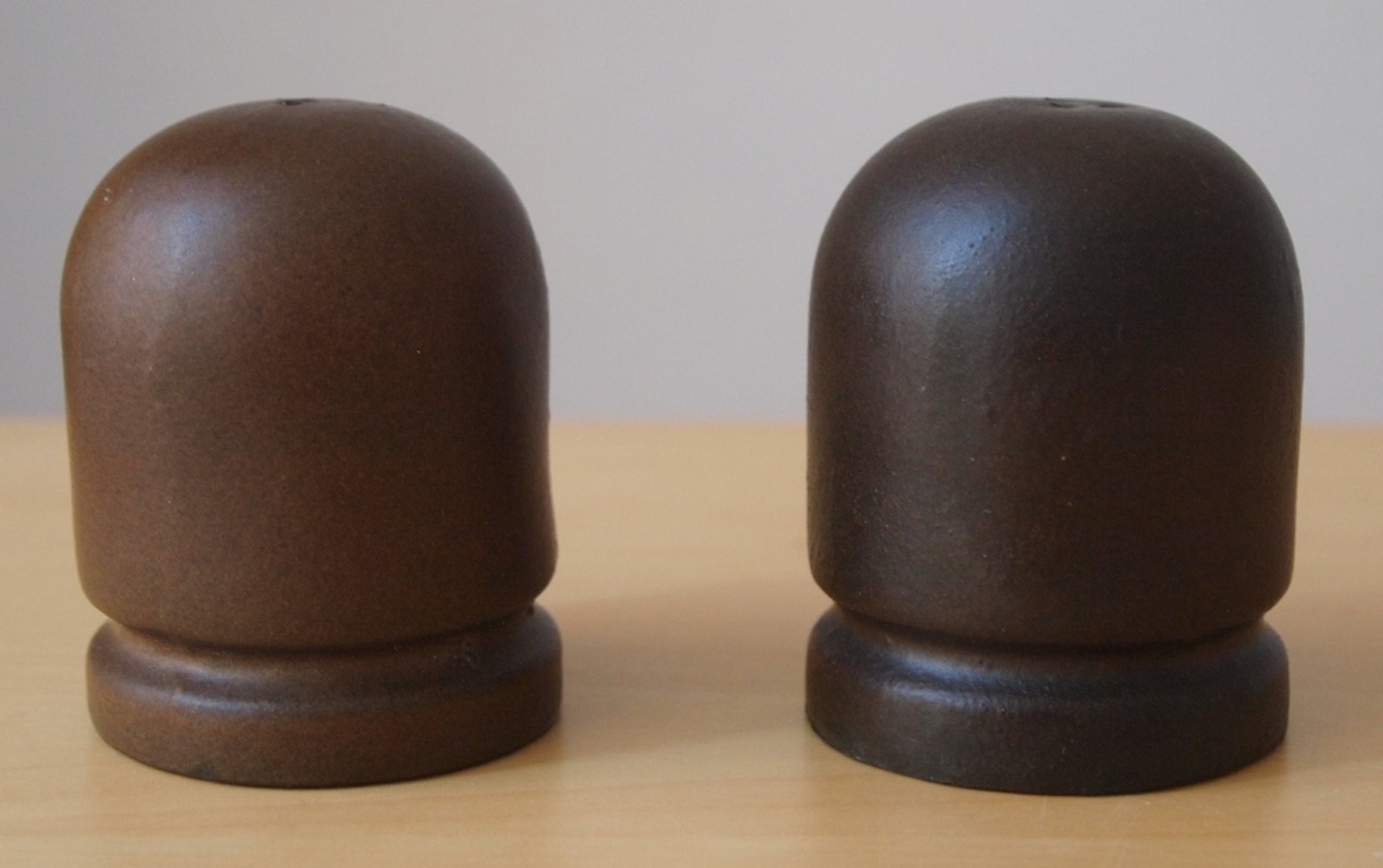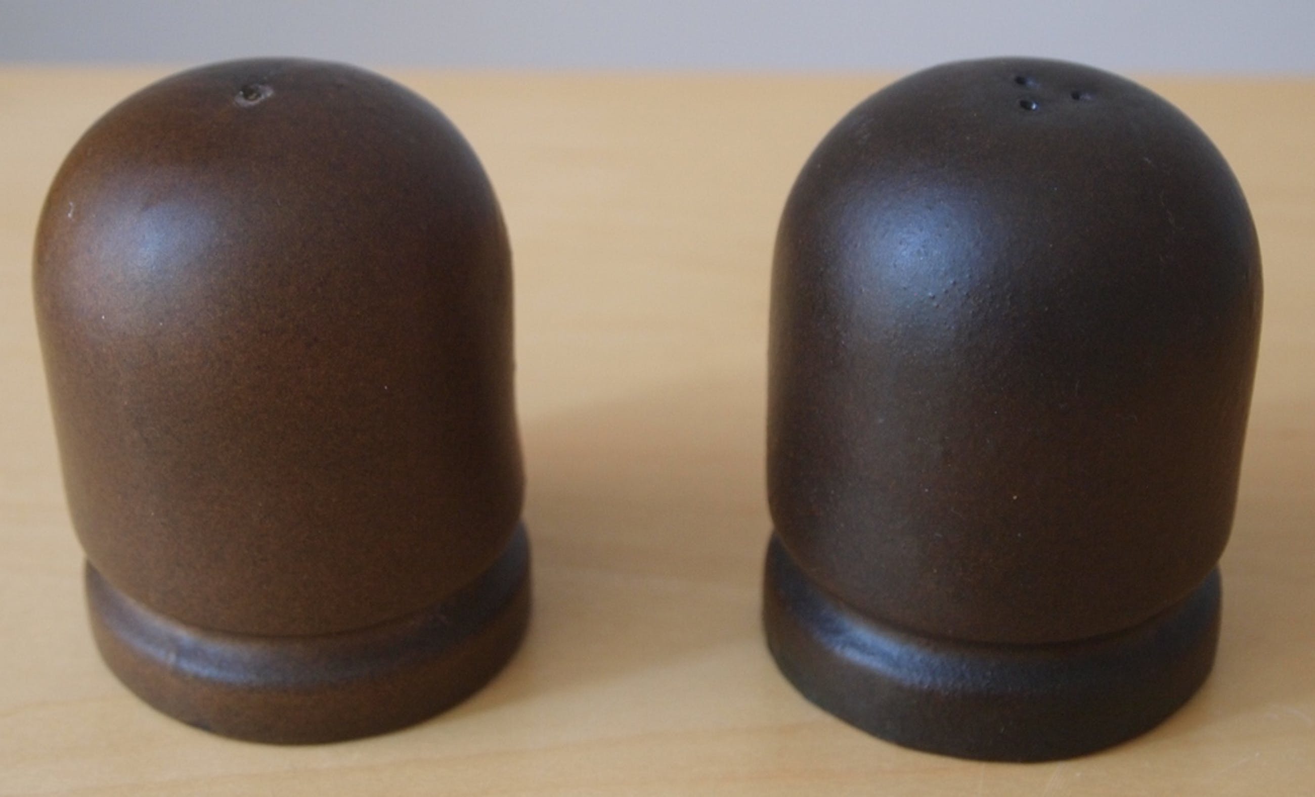 Bruin aardewerken peper- en zoutstel, ontwerp Zweitse Landheer voor Cor Unum. In goede staat, het zoutvaatje heeft bij de opening een fleebite. Niet gemerkt.